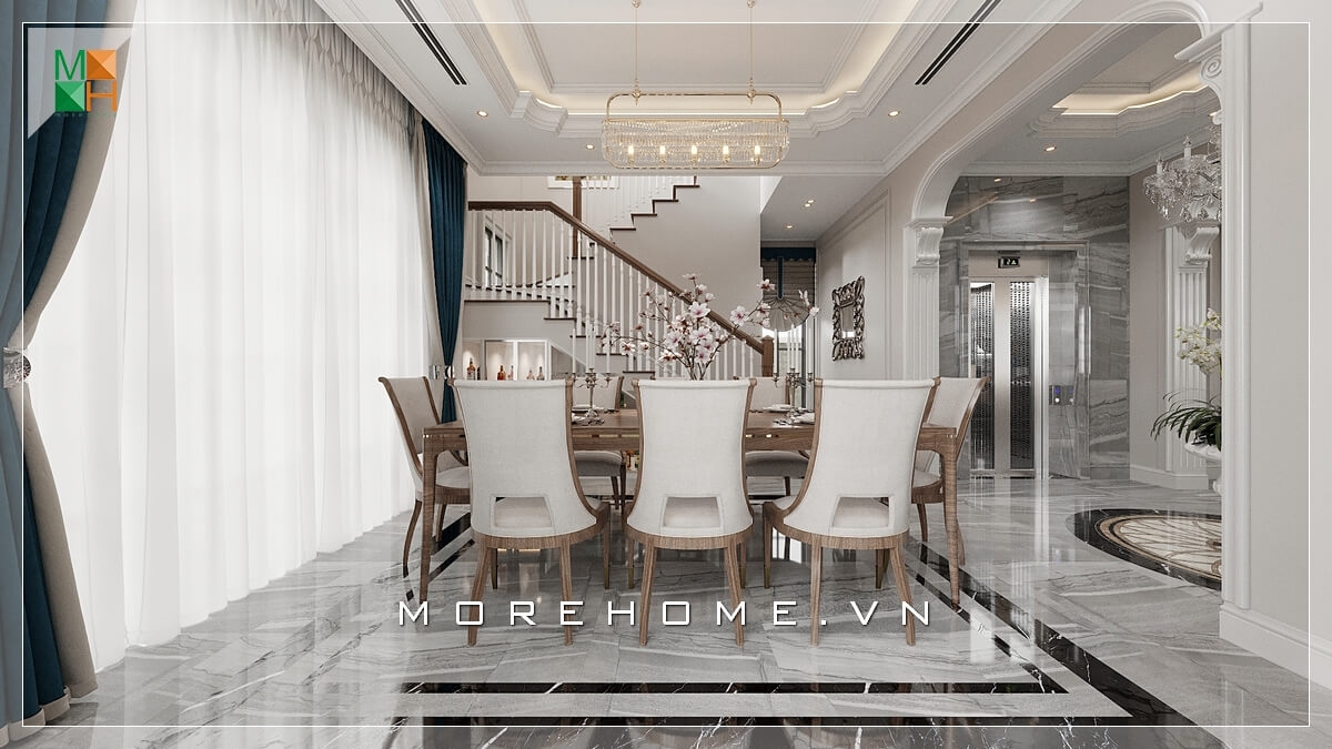 Thiết kế phòng ăn cao cấp sang trọng với sắc trắng tinh khôi thống nhất cùng phong cách tân cổ điển đầy tinh tế.