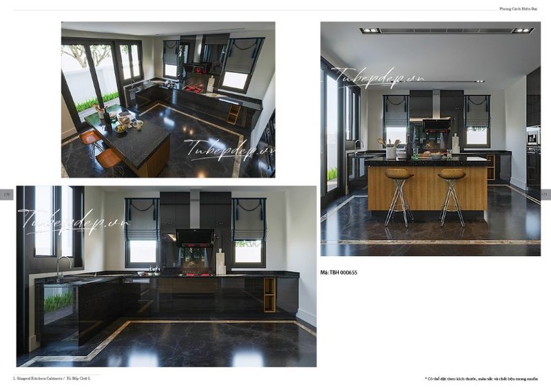 Tủ bếp acrylic màu đen đồng màu với đá ốp mặt bàn và sàn nhà tạo nên một không gian đồng bề. Bàn đảo độc lập ốp gỗ tự nhiên vàng làm nổi bật và tạo điểm nhấn sang trọng cho không gian.